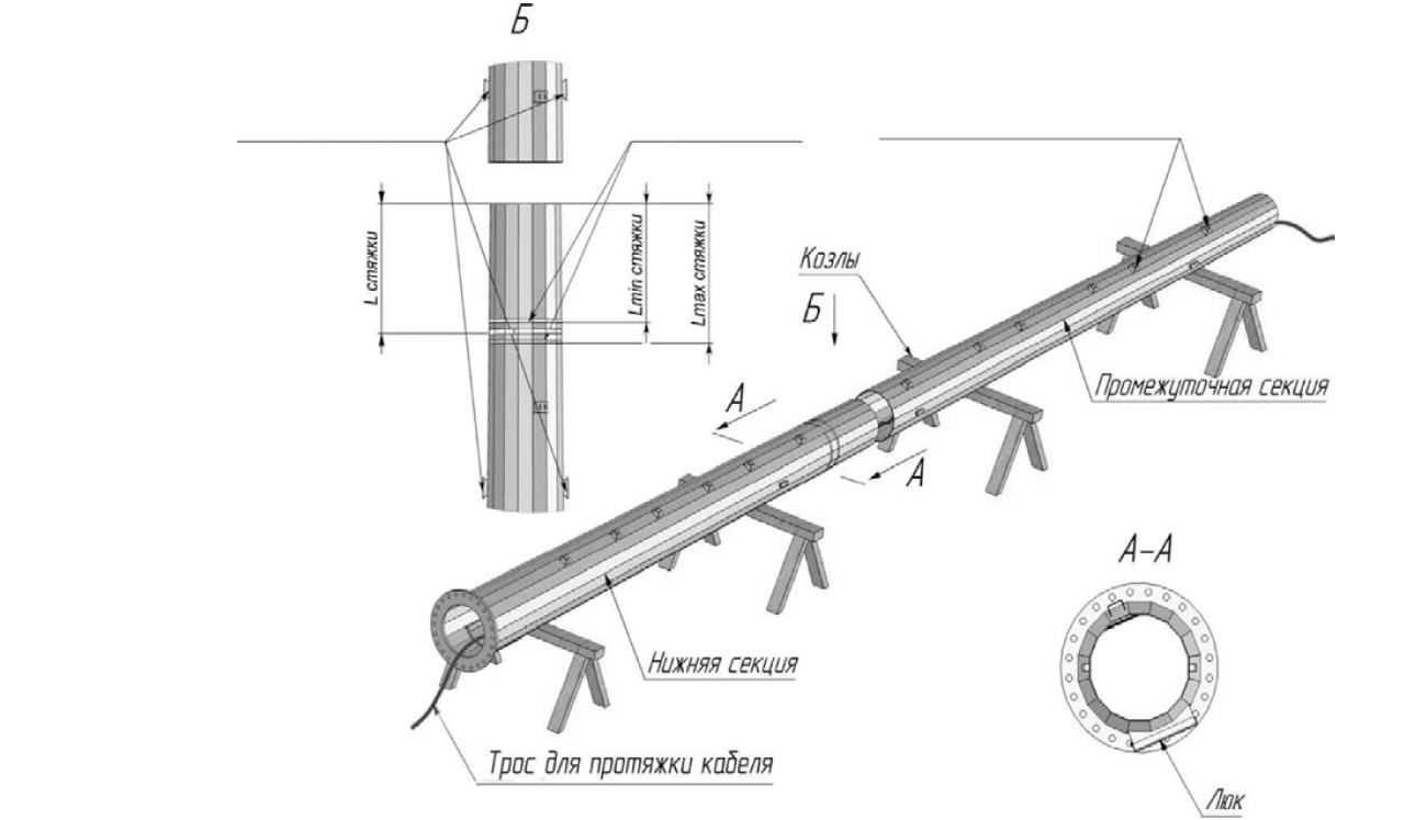 В случае опоры из трех и более секций сборку последующих секций производить в том же порядке с учетом уже стянутых стволов (занижнюю секцию принимаются уже стянутые стволы).