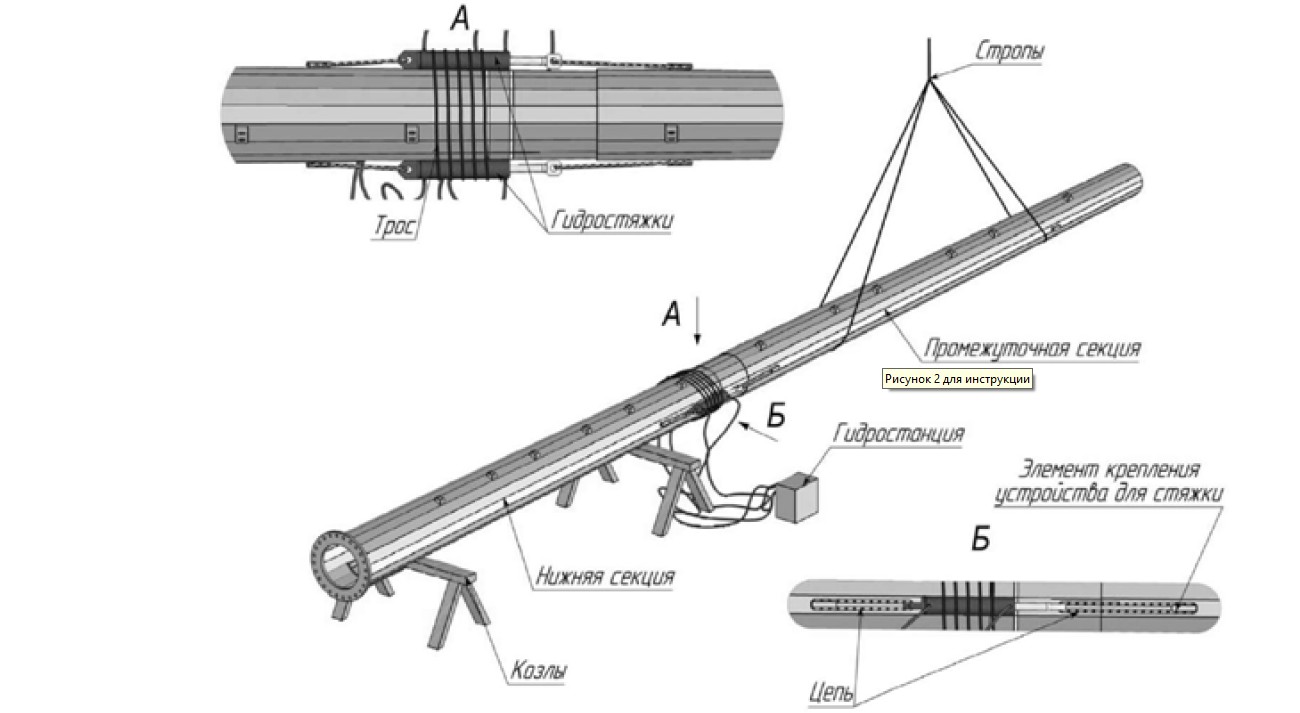 4. Установить устройство для стяжки (рекомендуется использовать устройство гидравлической стяжки или механические лебедки усилием от 3 до 5 тонн). В случае использования устройства гидравлической стяжки необходимо надежно закрепить стягивающие устройства стянув тросом к стволу, количество витков присоединительной цепи следует подбирать из условия превышения максимального усилия гидроустройства общим тяговым усилием витков цепи, (условие неразрыва звена).