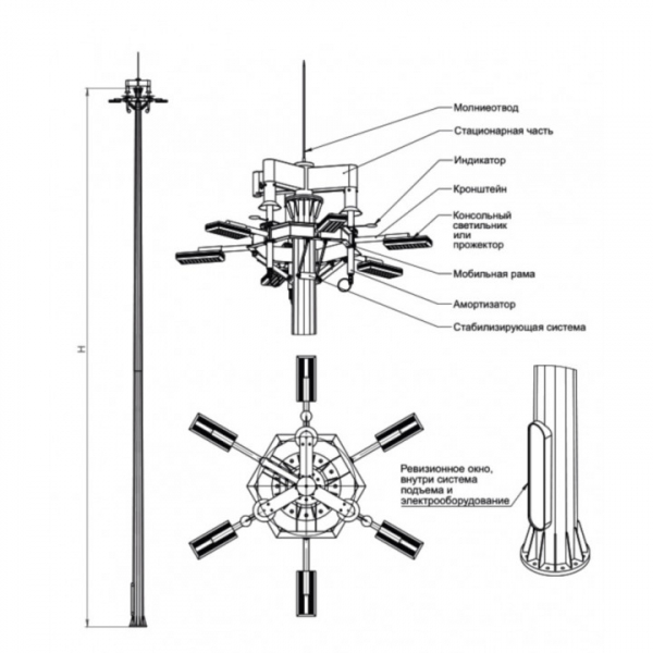 Высота высокомачтовых опор МГФ 35 метров. Их грузоподъёмность составляет до 500 кг. Количество прожекторов в каждой опоре — до 6 штук.
